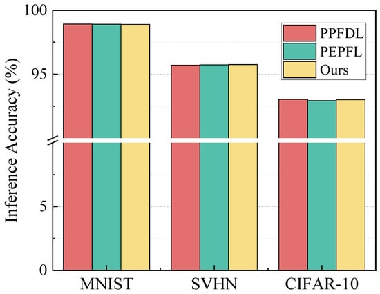 Next, the training effects of different schemes on various datasets have been compared. The MNIST dataset was trained using a common convolutional neural network, while the SVHN and CIFAR-10 datasets were trained using fine-tuned VGG16 and ResNet-18 networks. Figure 10 shows the inference accuracy on different datasets, and the final prediction accuracy of our system is basically consistent with that of other schemes.
