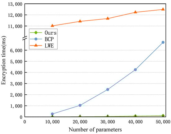 Figure 12 shows that as the number of parameters to be encrypted continues to increase, the time consumed for encryption also increases. The time for LWE encryption has shown a slight increase, but its basic time consumption is far greater than that of BCP and our scheme. The encryption time of the BCP method increases rapidly, but within 50,000 parameters, its encryption time is still less than that of the LWE scheme. Our scheme has the least encryption time consumption, highest operational efficiency, and smallest increase. Since the encryption time of Paillier far exceeds that of these methods, it is not shown in the figure.