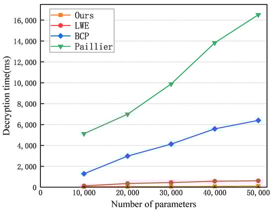 Figure 13 shows that as the number of parameters to be decrypted gradually increases, the running time of various methods also increases. Among them, the Paillier HE grows the fastest, followed by the BCP, LWE, and our method. This is because in our approach, a substantial amount of computation is completed in advance before decryption. Therefore, in the final decryption process, only table lookup is performed to accomplish the decryption, which makes our scheme more efficient than others.