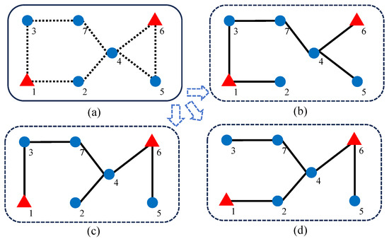 In a given meshed planning scenario, as depicted in Figure 1a, for Load bus 5, the shortest distance from Source bus 1 is three (path: 5-4-2-1), and from Source bus 6, it is one (path: 5-6). Therefore, the shortest distance from Load bus 5 to the source bus is one, specifically the distance from Load bus 5 to Source bus 6, denoted as the “source-to-load shortest distance”. By this definition, the shortest distance from Load bus 2 to the source is one (path: 2-1). It is imperative to note that the aforementioned computation of the source-to-load shortest distance metric is contingent upon a specific planning scheme, namely determining the closest proximity of each respective bus to the source bus within a meshed topology. However, during the actual operation of a DN, the requirement is typically radial. Consequently, under the prescribed operation conditions within the meshed topology, Load buses 5 and 2 may find it challenging to concurrently meet the criterion of the source-to-load shortest distance in the mesh grid. As illustrated in Figure 1b, only Load bus 2 satisfies the condition of being the shortest to the source bus, with the metric of one (path: 2-1), consistent with the result in the mesh grid. In this operation condition, the source-to-load shortest distance for Load bus 5 becomes two (path: 5-4-6), deviating from the result in the mesh grid. In the operation state depicted in Figure 1c, Load bus 5 exhibits a shortest path consistent with the meshed planning phase (path: 5-6), with a metric of one. Meanwhile, the metric for Bus 2 becomes two (path: 2-4-6). When operating under the radial topology depicted in Figure 1d, both Load buses 5 and 2 simultaneously meet the requirements for the source-to-load shortest distance in the mesh grid, i.e., the source-to-load shortest distance and path under this configuration align with the results obtained in the mesh grid illustrated in Figure 1a. Consequently, it is imperative to compute the source-to-load shortest distance metric within a given radial topology.