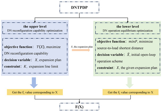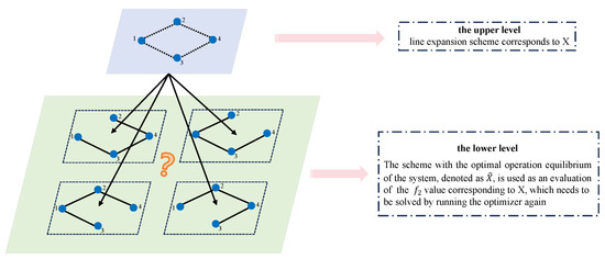 It is essential to note that in contrast to traditional bi-objective optimization, the evaluation of the operation scheme ( in the above context is framed as an optimization problem rather than a computational one. In the realm of traditional bi-objective optimization, evaluating any solution X involves directly computing its corresponding objective function values, a task achievable in constant time, . However, in the context of the bi-objective optimization problem proposed in this study, assessing the first objective function value for a given X is straightforward and also operates within complexity. Conversely, evaluating the second objective function value necessitates revisiting the optimization process, constituting a re-optimization rather than a mere calculation. Thus, determining the second objective function value associated with X no longer adheres to complexity. In other words, this problem simultaneously represents a bi-objective optimization with a sub-optimization problem challenge, which can be also called a bi-level challenge. Figure 2 illustrates the conceptual framework of the DNTPDP, which has the bi-level nature. To solve the DNTPDP, as shown in Figure 2, first, upper-level optimization involves obtaining an optimal topology design (mesh grid) through the optimization of line additions within a given radial topology. Subsequently, the sub-problem optimization in the lower level engages in radial operation scheme based on each designed topology (mesh grid) where the radial network corresponds to the subgraph generated by the design scheme. Given the diverse radial strategies available, the evaluation of the operation scheme becomes a sub-optimization problem. Therefore, when evaluating a new solution, it necessitates a re-optimization process. This entails invoking the optimizer again to solve the sub-optimization problem for the evaluation of the operation scheme.