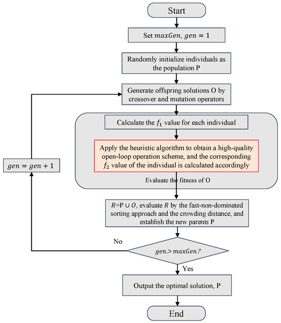 In order to verify the proposed idea, a popular algorithm, NSGA-II, is selected as the foundational algorithm framework for the bi-objective DN optimization model proposed in Section 3. Figure 4 depicts the comprehensive flowchart of the whole methodology employed to solve the DNTPDP. As shown in Figure 4, the value of can be calculated directly from the corresponding solution of the individual to evaluate the reconfiguration capability of the system. The position highlighted in red boxes denotes where heuristic algorithms are integrated into the NSGA-II algorithm framework, aimed at solving sub-optimization problems and evaluating the metric based on optimized results of the source-to-load shortest distance metric. Next, we elaborate on the implementation specifics of NSGA-II and the proposed heuristic algorithms.