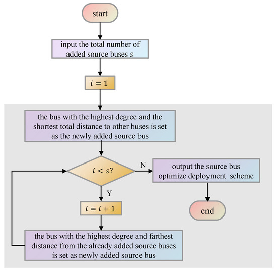 The implicit assumption of the WROH algorithm proposed in Section 4.2 is the given position of the source bus. The source bus determination heuristic algorithm proposed is applied to a scenario where the topological structure is planned and designed, but the exact locations of the source buses remain uncertain. Further optimization of the deployment of the source bus can be conducted to enhance the system’s equilibrium and reliability. Buses of greater importance should exhibit higher degrees, indicating stronger connections with other buses. Additionally, considering the distance between the bus and others is essential for the overall equilibrium of the system. Figure 6 illustrates the workflow of the algorithm for determining the source bus position, termed as the degree-distance heuristic (DDH) algorithm. This algorithm aims to optimize the deployment of the source bus by considering both bus importance, reflected in their degrees, and their spatial relationships with other buses.