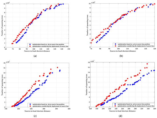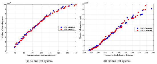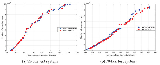 Embedding the WROH algorithm into the NSGA-II to solve the DNTPDP with fixed source bus scenario is denoted as NSGA-II (WROH), while incorporating the GA into the NSGA-II is represented as NSGA-II (GA). Figure 7 illustrates the Pareto front obtained through the employment of NSGA-II (WROH) and NSGA-II (GA), where the x-axis and the y-axis, respectively, depict the source-to-load shortest distance and the number of spanning trees. As depicted in Figure 7a, negligible disparities in the Pareto front are discerned when applied to the IEEE 33-bus test system using both approaches. Table 5 delineates the average computation time taken for 5 independent runs of NSGA-II (WROH) and NSGAII (GA). The results underscore that for each test system, NSGA-II (WROH) necessitates a lesser computation time in comparison to the NSGA-II (GA) algorithm. Specifically, for the 33-bus test system, NSGA-II (GA) demands 34,565 s, whereas NSGA-II (WROH) requires a mere 123 s, revealing a substantial disparity. NSGA-II (WROH) demonstrates an efficiency improvement of 281 times compared to NSGA-II (GA) on the IEEE 33-bus test system. Similar trends are evident on the IEEE 70-bus system, where NSGA-II (WROH) achieves a 455-fold efficiency gain compared to NSGA-II (GA), as illustrated in Figure 5b and Table 5. In the context of DNTPDP with a fixed source bus, utilizing NSGA-II (WROH) to solve this problem improves computational efficiency by several hundredfold compared to employing NSGA-II (GA).