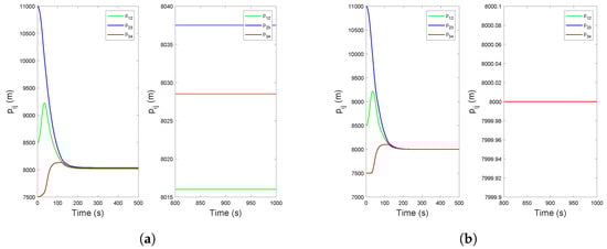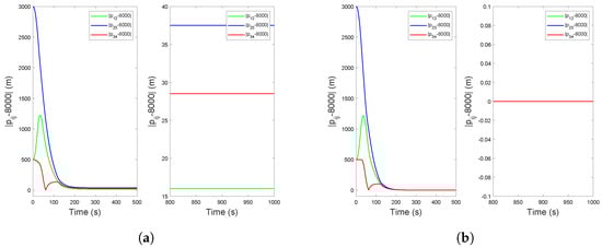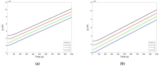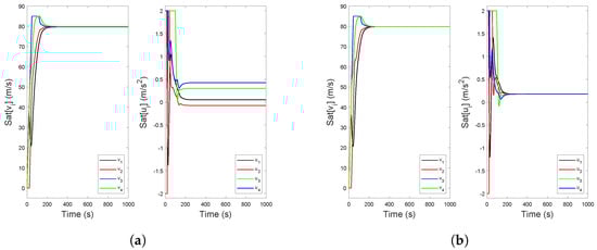 Figure 2 and Figure 3 show the states and control inputs of all trains. The distances between neighboring trains are shown in Figure 4 and Figure 5. The results indicate that all trains will finally move in a desired formation with some certain relative position errors. By calculation, . The original relative position of 8000 m plus the maximum potential error of 7694 m, resulting in a total distance of 15,694 m, is acceptable because it meets the current safety requirements based on practical scheduling guidelines.