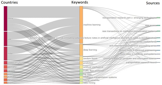 The diagram distinctly accentuates three pivotal countries that have emerged as influential drivers in shaping this research terrain: China, the United States, and India. These nations have consistently exhibited remarkable prominence in propelling advancements at the nexus of transportation and machine learning. Moreover, the diagram informs three predominant keywords that have captured substantial attention within the discourse: “machine learning”, “deep learning”, and “prediction”. These keywords encapsulate the quintessence of research endeavors focused on leveraging computational intelligence to elevate predictive modelling and analytical capacities within the ambit of transportation systems. Significantly, the Sankey diagram also spotlights the primary sources that serve as critical conduits for disseminating cutting-edge research outcomes in this domain. Noteworthy among these sources are the journals od “Transportation Research Part C: Emerging Technologies”, “IEEE Access”, and the “IEEE Transactions on Intelligent Transportation Systems”.