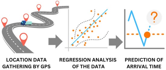 The precise forecasting of heavy truck movements’ timing and location is crucial for the efficient operation of cross-docking terminals, which are integral to the management of consumable goods, just-in-time inventory strategies, and rapid distribution across various locations [1,2,3,4]. Over the last three decades, numerous studies on transportation have focused on generating short-term forecasts for traffic variables, including traffic flow patterns, flow velocity, travel durations, and matchmaking distances [5,6,7]. Estimating travel times for commercial vehicles in urban environments presents significant challenges due to limited observed data, numerous origin–destination pairs, and variations in travel times primarily caused by traffic-related delays [8,9,10].