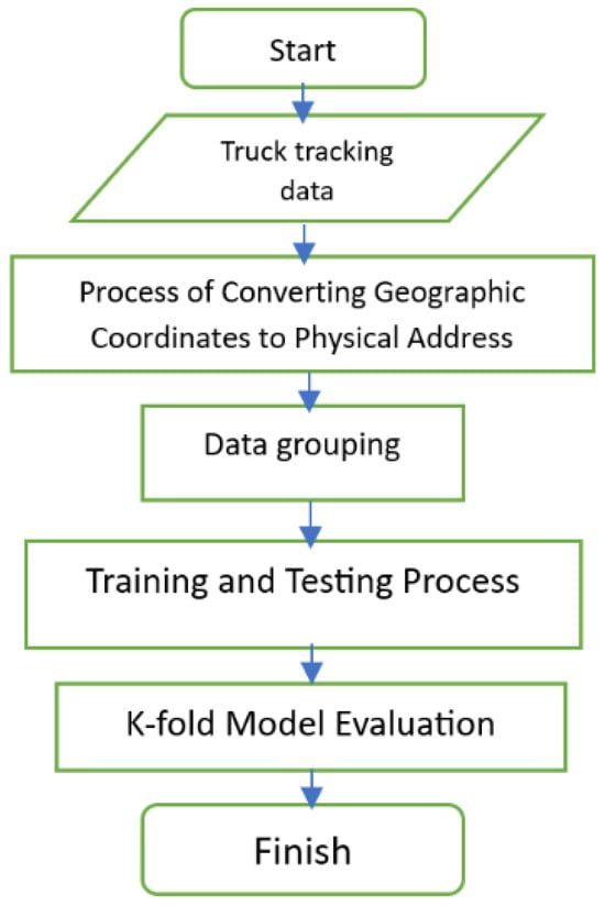 Jiang [23] focused on predicting bus transit times using bus GPS data and artificial neural networks. Accurate predictions were essential for urban transportation planning and optimizing bus schedules. Jiang introduced three predictive models for travel time estimation, each based on a three-layer neural network architecture. The first model predicted total travel time using calculated features from bus GPS data. The second model utilized information from preceding buses to predict segment travel times, and the third combined segment predictions to estimate the total route travel time. Wang et al. [24] presented an innovative method for predicting truck traffic flow using sampled GPS data within road networks. They employed a two-stage framework: expansion and prediction. The expansion phase used a piecewise constant coefficient method to align the sampled and actual truck flows, considering road gradients and traffic flow magnitudes. The prediction phase applied Long Short-Term Memory (LSTM) and Gated Recurrent Unit (GRU) methodologies, significantly improving prediction accuracy. In recent research, Demissie and Kattan [25] explored large-scale GPS data streams to estimate truck origin–destination flows. They developed an exploratory framework to identify significant events such as truck halts and trips, supported by the Pearson correlation coefficient and an entropy measure. This approach facilitated the comparative analysis of truck movement patterns and identified potential shifts in truck travel dynamics over a year. The researchers then used a multinomial logistic model to develop destination choice models across five time intervals.
