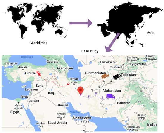 This research is based on a detailed dataset consisting of 14 Excel files specifically organized to store truck tracking data from 17 June 2021, to 3 August 2022. Consistently, each file contains an astounding aggregation of 1,048,576 records. This data includes locations in the routes of the trucks, from different cities in Iran to cities in Turkey, Turkmenistan, Tajikistan and Afghanistan (Figure 5).