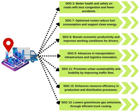 The present study aligns with several Sustainable Development Goals (SDGs) through its implications in logistics, urban planning, and transportation efficiency. The following sections provide a detailed assessment of the study’s impact on specific SDGs [49,50,51]: