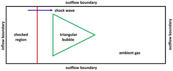 Figure 1 illustrates the problem organization involving a shocked backward-triangular gas bubble. The numerical simulations are conducted within a rectangular domain measuring . The setup features a stationary backward-triangular bubble of edge length mm and a moving planar shock wave along the x-direction, characterized by Mach numbers and 1.50. The planar shock wave is initially established 20 mm from the left domain boundary, and the backward triangle is established 5 mm from the incident shock. The top, bottom, and right boundaries of this computational domain are defined as outflow, whereas the left boundary is represented by an inflow condition. In this organization, the ambient environment is nitrogen () gas, while two distinct gases—helium (He) and sulfur hexafluoride ()—are utilized as the testing gases inside the backward-triangular bubbles. The material attributes of tested gases are compiled in Table 1. Furthermore, = 101,325 Pa and K are the initial pressure and temperature values around the backward-triangular bubbles, respectively.
