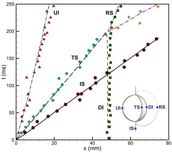 Characteristic interface point (IS, UI, DI, TS, RS) comparison between the experimental (reproduced with permission from [15], Cambridge University Press, 1987), and present numerical results for a shocked cylindrical heavy bubble. The experimental and current numerical results are represented by the symbols and the lines, respectively.