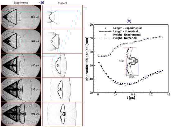 Comparison of (a) numerical shadowgraphs, and (b) evolving interfacial characteristic scales (i.e., length and height), between the experiments (reproduced with permission from [33], Cambridge University Press, 2014) and the present results for a shocked forward-triangular light bubble at .