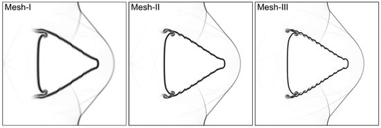 In order to precisely represent the intricate flow field structure of RMI evolution, a mesh convergence analysis is carried out. This entails applying a third-order accurate modal DG solver to a test case on a shocked backward-triangular He bubble using three grid configurations: “Mesh-I”, “Mesh-II”, and “Mesh-III”, with grid points of , , and , respectively. The numerical schlieren pictures of the shocked He bubble at time are displayed in Figure 5. At this point, the bubble is compressed by the shock wave, resulting in a divergent shape with primary vortex rings at the upstream corner. The Kelvin–Helmholtz instability (KHI), which is shown as small-scale vortices on the bubble interface and becomes more pronounced and observable at finer grid sizes, is the primary distinction between the three meshes. As a result, the ’Mesh-III’ configuration is used for all numerical calculations.