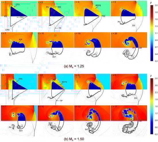 Figure 6 shows the time evolution of flow structure in the shocked backward-triangular He bubble at different Mach numbers , 1.50, where density contours are shown in the upper half of each sub-figure, while numerical shadowgraphs are shown in the lower half. Remarkably, comparable physical processes are noted for both Mach numbers. In the instance of as illustrated in Figure 6a, a leading transmitted shock (TS1) passes about one-third of the length of the bubble downstream as the incidence shock (IS) wave strikes the triangular bubble, while a rarefaction shock (RS) wave moves upward together with a curved reflected rarefaction (CRR) wave in the ambient (). The TS1 wave inside the triangular helium bubble travels much quicker than the IS wave outside the bubble because helium has low density. The IS and the TS1 wave are connected by the free precursor shock wave (FPS), which is formed as the bubble interface refracts the TS1 wave once again. As a result, an erratic pattern is produced, which includes a Mach stem (MS) and triple points (TP) outside the bubble (). Due to the vorticity deposition, tiny primary vortex (PV) pairs are seen at the left corners of the triangle bubble. A second transmitted shock (TS2) forms as time goes on and moves downward in the flow field as the TS1 strikes with apex corner of triangular bubble (). Furthermore, two oblique shock waves, the so-called reflected free precursor shock (RFPS) waves, are now connected and continue their propagation downstream. A diffracted shock (DS) wave is also observed in the flow fields over time (). The impact of the IS wave on the evolution of interface morphology gradually decreases, and on the triangular interface, the KHI leads to the emergence of certain modest vortex forms (). With proceeding time, the triangular bubble continues to deform and takes a trapezoidal shape with its larger part facing the on-coming post-shock flow. Furthermore, one secondary vortex (SV1) ring is observed at the triangular interface to abundance of baroclinic vorticity production (). In addition, the triangle’s left interface begins to sink inward due to the formation of a re-entrant helium jet. As the jet eventually reaches the downstream bubble interface, the main vortex (PV) rings form and grow over a bridge almost symmetrically. Subsequently, the flow field is entirely controlled by the jet and rings of vortex formed ( =15–20). Remarkably, the high Mach number causes a stronger interaction between the shock and bubble, as shown in Figure 6b. Furthermore, as the Mach number increases, the bubble deforms significantly. As a result, the generated wave patterns become more complex, and the triangle size decreases noticeably. Furthermore, there is a notable increase in the strength of the rolled-up vortices, leading to the generation of several secondary vortex rings at the triangle interface. These vortices are conspicuous at the interface between the bubble and surrounding gas due to the baroclinic vorticity deposition.