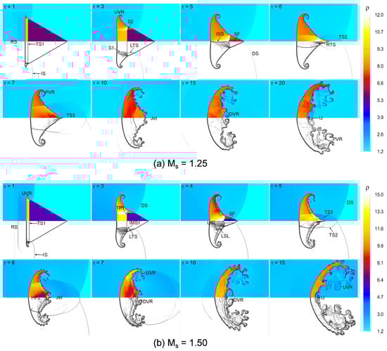 Figure 7 illustrates the time evolution of the flow structure in the shocked backward-triangular bubble at and 1.50. In both scenarios, the flow structure generated by the shocked backward-triangular bubbles is similar. Because of the higher density of the bubble, the IS wave moves more slowly inside than outside, with the IS wave outside the bubble moving far faster than the TS1 wave inside. In the case, depicted in Figure 7a, the IS wave passes through the triangular bubble, sweeping its front and sides (). This results in the formation of a lateral transmitted shock (LTS) wave, which moves downstream more slowly than the IS wave, and a reflected shock (RS) wave moving upstream. Additionally, baroclinic vorticity forms a small upstream vortex pair (UVR) at the left corners of the triangular interface. Over time, the IS wave propagates over the upper and lower interfaces of the bubble, leading to irregular refraction. Two slip lines (USL, LSL), triple points (TP) inside the bubble, an internal Mach stem (IMS1), and extra shock waves (S1 and S2) are produced by the interaction between the TS1 and LTS waves. The IS wave’s main portion eventually passes in front of the bubble, and a curved diffracted shock (DS) wave joins the top and bottom ends of the wave’s two straight portions. Concurrently, in the leeward corner of the triangle, reversed transmitted shock (RTS) and inward secondary shock (ISS) waves emerge and go upstream (). The collision of the DS waves causes a shock focusing (SF) phenomenon inside the triangle near the leeward stagnation point. Over time, the UVR grows, and two additional transmitted shock waves (TS2, TS3) form after focusing, extending outward downstream. Peak pressure is eventually created by the intricate interaction of shocks inside the bubble along the downstream centerline ( = 10–15), which leads to the formation of a jet and downstream vortex rings (DVR). Rolled-up vortices become more noticeable near the bubble–gas interface as their size increases. The resultant jet develops along alike vortex pairs (). In Figure 7b, the higher shock Mach number causes stronger interaction between the shock and bubble, leading to significant deformation of the backward-triangular bubble. Additionally, due to baroclinic vorticity deposition, the rolled-up vortices become stronger and larger, particularly noticeable at the interface where the bubble meets the surrounding gas.
