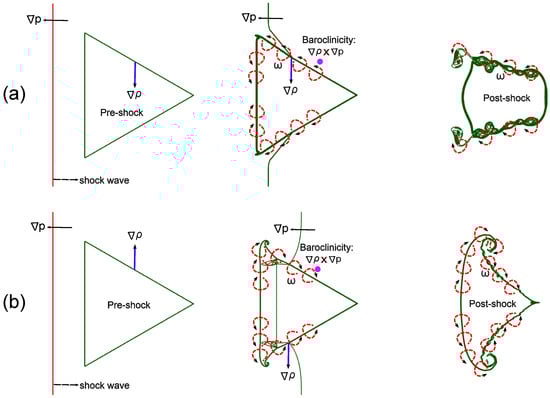 Abstract representation of vorticity generation in shocked backward-triangular bubble filled with (a) light and (b) heavy gases.