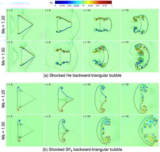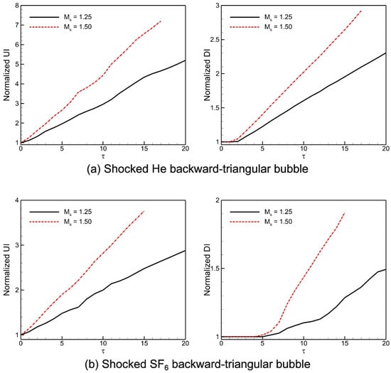 Figure 15 displays the temporal variations of the normalized UI and DI distances of the computed shocked He/ backward-triangular bubbles subsequent to the IS wave’s impact. and are the respective computations of these quantities, where the original distances of the UI and DI positions from the initial IS wave position are denoted by and , respectively. The outcomes demonstrate that for both shocked backward-triangular He/ bubbles, the normalized UI acts similarly in the early phases. It then accelerates, which is most likely the result of rarefaction waves that are produced when the shock wave interacts with the downstream contact. Strong compression effects cause the normalized UI value of the He triangular bubble to exceed that of the triangular bubble. Conversely, during the initial phase, the normalized DI value of triangular bubbles remains motionless until it encounters the secondary transmitted shock wave (TS2). Once the TS2 wave has cleared, normalized DI attains a certain velocity that triggers the acceleration of the vortex rings (UVR, DVR). The value of normalized DI enhances in the He bubble in comparison to the bubble. Interestingly, in both cases, the fastest displacement of the normalized UI and DI occurs at the higher Mach number , whereas the slowest displacement is observed at the lower Mach number .