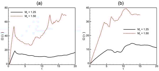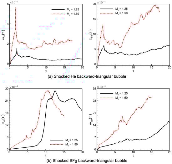 Spatial integrated fields of enstrophy in shocked (a) He; (b) backward-triangular bubbles at Mach numbers and 1.50.