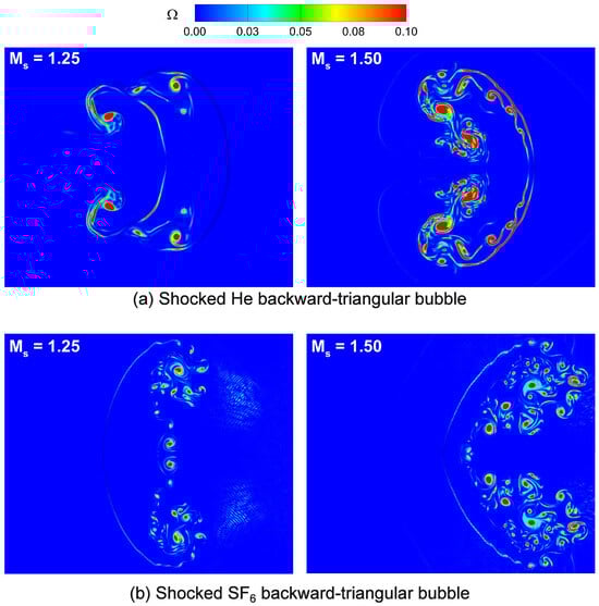 Enstrophy contours in shocked (a) He; (b) backward-triangular bubbles at with Mach numbers and 1.50.