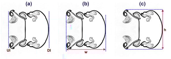 In this section, we perform a quantitative analysis of the interface characteristics of the shocked He/ backward-triangular bubbles. In addition to the displacement of the upstream interface (UI) and downstream interface (DI), these interface characteristics also comprise the interface height in the y-direction and the interface width in the x-direction, as illustrated in Figure 13. Furthermore, the interface deformation history of the shocked He/ backward-triangular bubbles at critical time instants is depicted in Figure 14. The bubble interface condenses in the wave’s direction as soon as it collides with the IS wave. The top and bottom margins approach the horizontal axis of symmetry more closely than the center portion does. The effect of the IS wave causes the upstream side to press inward earlier than the downstream interface, which moves quickly. Due to vorticity deposition, two tiny vortices finally form at the interface’s left corners. The impact of the IS wave on the interface varies with time as the corner vortex pair progressively expands. Then, as the upper and lower interfaces fold inward toward the flow axis in a similar manner, the bubble surface deforms into divergent and convergent shapes.
