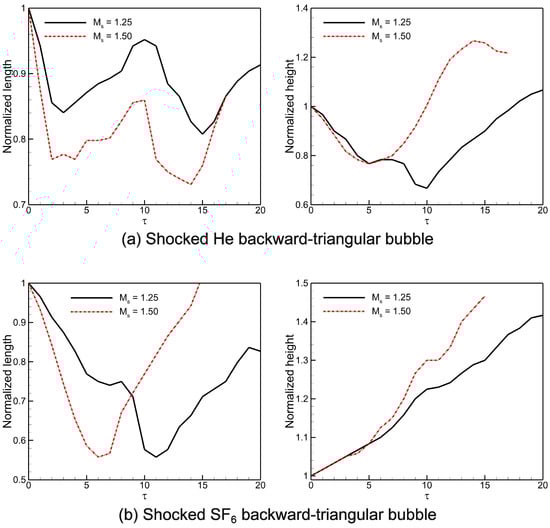 Figure 16 depicts the temporal variations of the normalized interface width and height for the computed shocked He/ backward-triangular gas bubbles at different shock Mach numbers. These normalized amounts are described as and , with the subscript ‘0’ representing the initial interface value. When the evolving interface hits the bubble in the first interaction phase, the breadth of the evolving interface is greatly reduced by the IS wave compression. After that, the acceleration of vorticity-driven velocity causes the bubble diameter to rapidly rise as vortex ring pairs develop at the upstream interface. After the compression phase, the interface width remains nearly constant for a brief period. In the He triangular bubble, the interface width exhibits alternating growth patterns due to the formation and breakup of various vortex rings. Conversely, the bubble shows a consistently increasing interface width because of continuously growing vortex rings. Interestingly, the interface height increases due to the vortex pair’s constant rotation until the interface is affected by reflected shock waves, which slows down the rate of height growth. The maximum interface height is observed in the He bubble, while the minimum height is seen in the bubble.