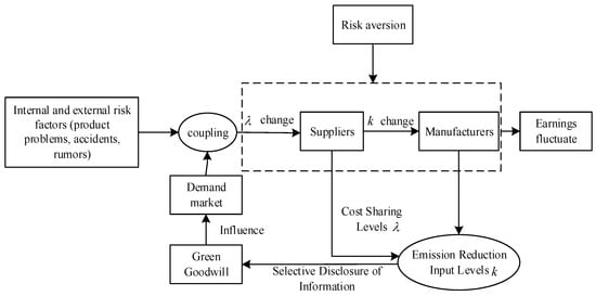 Referring to the study of Wang et al. [30], joint carbon emission reduction in the supply chain consists of two phases: at the beginning of the joint emission reduction period, the supplier makes an emission reduction decision and decides on the proportion of the emission reduction cost to be shared by the manufacturer, denoted by ; in the second stage, given the sharing ratio, the manufacturer decides on the level of investment in carbon abatement technologies, denoted by . It is assumed that both make decisions with the goal of maximizing their own interests. Internal and external emergencies in the supply chain take advantage of the vulnerability of the supply chain system to cause damage to the supply chain system, bringing losses to the upstream and downstream enterprises of the supply chain and the entire supply chain. When the supply chain’s internal and external unexpected risk factors act, it causes the product green goodwill and market demand fluctuation, and coupling with the supply chain structure triggers the risk. Fluctuations in market demand for low-carbon products will affect the emission reduction decisions of enterprises under different risk aversion characteristics, thus triggering changes in the level of suppliers’ emission reduction cost-sharing and leading to changes in the level of manufacturers’ emission reduction inputs. At the same time, there is uncertainty in the research and development and application of low-carbon technologies, and technological failure or failure to achieve the expected results will bring losses to enterprises. The links in a low-carbon supply chain are interdependent, and problems in one link can be transmitted to the entire supply chain. Fluctuations in the level of mitigation inputs will have an impact on low-carbon supply chain coordination, the process of driving carbon reductions, and business costs. Changes in this indicator will be of concern to investors, consumers, regulators, and other stakeholders, affecting the competitive position and long-term sustainability of enterprises. This process affects low-carbon supply chain coordination, the promotion of carbon emission reduction efforts, and overall enterprise costs, consequently altering the benefits accrued by both suppliers and manufacturers . The joint emission reduction decisions of enterprises and the risk transfer process of the low-carbon supply chain are shown in Figure 1.