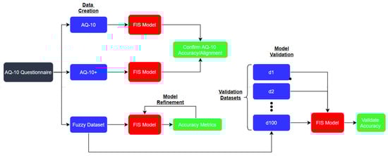 The extensive applications of deep learning in ASD are acknowledged. However, this study’s primary innovation lies in its focus on explainability and alignment with clinical tools like the AQ-10. Deep learning models, despite their accuracy, often lack transparency, making them less suitable for clinical settings where decision-making processes need to be clear. The FIS developed in this research addresses the nuanced behavioral traits of autism and manages the uncertainty in diagnosing higher-functioning adults, prioritizing late diagnosis in adults. By using a rule-based approach, which can be easily understood by clinicians and stakeholders, this system enhances trust and usability. Addressing a significant gap, the study focuses on high-functioning individuals and adults at risk of missed diagnoses. Moreover, the system accurately models the AQ-10, enhancing clinical validity and facilitating greater acceptance among clinicians by mirroring familiar diagnostic tools. In this context, the integration of Fuzzy Logic into the diagnostic process presents a promising avenue. Fuzzy Logic, with its ability to handle imprecision and variability inherent in human judgments, offers a novel approach to interpreting the nuanced and often ambiguous symptoms of ASD. This method could potentially bridge the gap between the subjective nature of current diagnostic practices and the objective clarity sought through quantitative research. To this end, a Fuzzy Inferencing System (FIS) was implemented and extensively tested for making referral decisions for full autism diagnosis. Its primary functionality enables diagnosis in line with AQ-10 criteria, providing a systematic and reliable approach that has already been proven to be clinically valid [3]. Additionally, informed by our research and suggestions, the system’s second functionality offers second opinion decisions for borderline cases, again utilizing AQ-10 criteria but with a new interpretation of the data. The system was rigorously tested across its full input range to evaluate its Fuzzy Logic capabilities. This comprehensive testing is crucial, as the first two functions operate under a more deterministic framework. Our approach ensures the FIS is not only accurate accurate according to a widely used clinical tool but also adept at handling the subtleties and complexities of borderline situations. Lastly, validation tests were conducted.