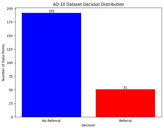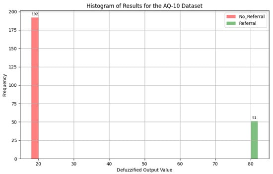 Three separate datasets were created to test the system. The first dataset is designed to assure that the system will output correct decisions according to AQ-10 criteria. The original AQ-10 dataset is bimodal with 70% of the data clustering into a no referral group, with the remaining 30% of the dataset grouped into the referral group (Figure 3).