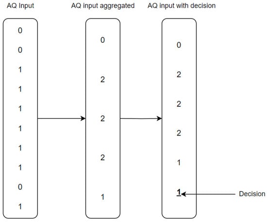 After deleting the duplicates the AQ-10 dataset contains 243 input records. Applying a threshold where the total sum exceeds 6, the resulting dataset was concatenated with a single column of the output decisions (Figure 4). Let represent the ith element of the input array, where , and each is a feature mapped to its associated membership function. The five membership functions correspond to the AQ-10 autism trait categories (Section 7).