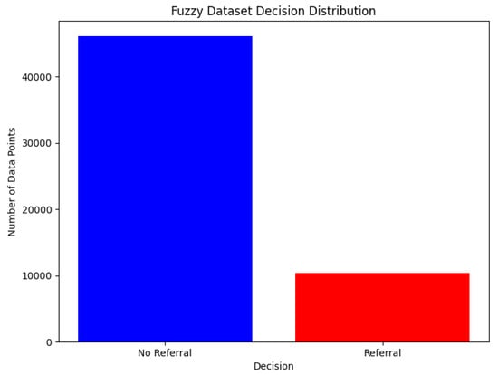 Each data point in the fuzzy dataset is an ordered tuple , where corresponds to the value in column and y is the decision variable’s value, determined by the sum of the first five column values. These points are denoted as for (superscripts do not indicate exponentiation in the mathematical notation throughout this paper; they are used for indexing only). Specifically, let the sum for each data point . Then, the value of y (or Y) for each data point is calculated from , akin to the methodology used in the AQ-10+ dataset, allowing for the consideration of borderline cases. The value of is determined as follows:
