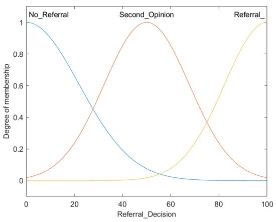 In these conditions, , and represent the membership degrees for the no referral, second opinion and referral fuzzy sets, respectively.