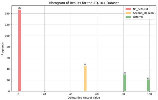 The fuzzy dataset is designed to evaluate an expanded input range for the input membership functions and for the output range of the FIS. Until now, in alignment with the well-established referral tool AQ-10, the system has exhibited a largely deterministic nature. The inputs to the system have been confined to discrete points on the x-axis, specifically 0, 1 or 2. Similarly, the output range produced the same defuzzified values, with 18.5 indicating a “no referral” decision and 81 signifying a “referral” decision (Section 8.1). The fuzzy dataset involves uniform sampling across the entire potential input spectrum of the fuzzy system, encompassing not only integer values 0, 1, 2, but also the fractional values in between. Feeding the FIS with this continuous range of inputs enables a thorough mapping of its response surface. This process is crucial for visualizing and understanding the variations in FIS output as the inputs change.
