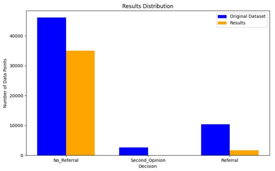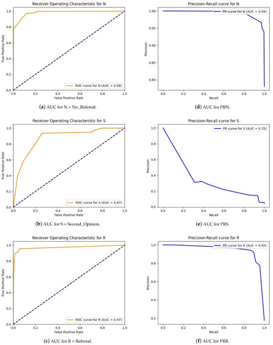 Following the presentation of the results, the discussion can now consider the implications of these findings. The extensive fuzzy dataset, which included 59,049 data points and a finer gradation of input values, presented a rigorous test for the system’s ability to manage a vastly expanded input space. The system maintained high overall accuracy at 92.91%, with a membership degree accuracy of 92.47%, indicating robust performance under varied and less predictable conditions. The validation datasets support these findings. The ROC curves and Precision Recall results further highlight the system’s strong capability in distinguishing no referral and referral cases, achieving AUC values of 0.98 and 0.97, respectively. However, the true positive rates for referrals and second opinions were lower, at 15.74% and 1.36%, respectively, suggesting a conservative bias in the system’s decision-making process. The system effectively identified the majority of cases requiring no referral, with a true negative rate of 75.81%, crucial for minimizing unnecessary clinical evaluations. Yet, the classification of second opinions, as evidenced by a lower AUC of 0.87, remains a challenge, with the system correctly predicting second opinions in only 804 out of 2951 cases, illustrating a potential area for improvement in reducing false negatives and misclassifications. Notably, the FIS misclassified 1162 second opinion decisions as no referrals, and 608 as referrals, highlighting its struggle with these intermediate cases.