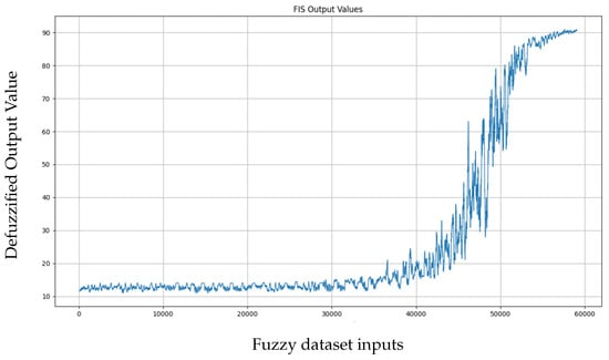 The fuzzy dataset is composed of data points, each represented as a 6-dimensional vector. This dataset is organized into a matrix with n rows and columns. The first columns, and , constitute the feature space with values ranging from 0.2 to 1.8 in increments of 0.2. Lowering the step size creates a larger dataset that increases the granularity of the input space, but has the drawback of creating more computational overhead in testing and fine tuning the FIS. A step size of 0.2 resulted in acceptable running speed. A dataset with a step size of 0.1 was tested (Results Section 8). The last column, denoted as Y, serves as the decision variable, adopting values from the set {0, 0.5, 1}.
