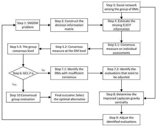 This section elaborates on the improved Laplacian gravity centrality-based consensus-reaching model with incomplete ELICIT information. Section 3.1 briefly describes a typical GDM problem in social network environments. In Section 3.2, we introduce the improved Laplacian gravity centrality, which can leverage local and global network information to quantify the influence of DMs within the group. Subsequently, Section 3.3 proposes the improved Laplacian gravity centrality-based consensus-reaching strategy to enhance the group consensus for a consensual solution. Finally, in Section 3.4, the framework and steps of the proposed method are summarized.