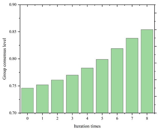 Subsequently, the updated group consensus level after the first iteration can be obtained as . We can observe that the level of agreement within the group has been increased, yet it has not met the predetermined consensus requirement. Consequently, we continue to iterate the aforementioned procedures until the group consensus satisfies the threshold criteria. First, the DMs with insufficient consensus levels are identified with Equation (19). Second, the specific evaluations that fall short of the consensus threshold are recognized by Equation (20). Then, the identified evaluations are updated based on their improved Laplacian gravity centrality with Equation (21). Subsequently, the consensus on the three levels is checked again. Since the methodology utilized for the iteration process is the same, the detailed procedure is omitted here. After another five iterations, the GCL increased to 0.854, which satisfies the preset consensus requirement. The total execution time of the proposed algorithm for this group of DMs to reach the satisfied consensus is 2.81 min. The enhancement in the group consensus is illustrated in Figure 7. Table 6 presents the satisfactory consensual group evaluations.