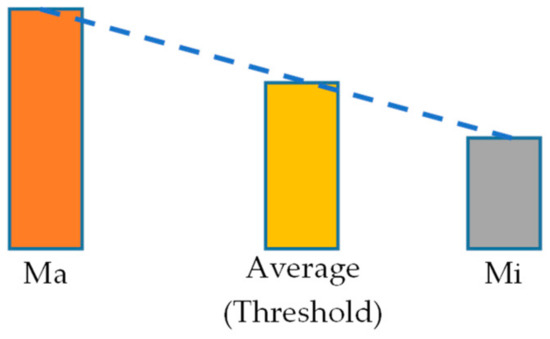 To set up the threshold, this method simply averages the maximum and minimum value of the data or the set of alternatives as follows: (Max + Min)/2, as illustrated in Figure 2. It assumes linearity regarding the rate of change between a low and a high threshold; that is, this method considers that one point in the high zone is equally as important as a point in the medium or low zone. When this method is used in risk models, another error that occurs is that it considers the maximum as intrinsically risky (will always be above the threshold) and the minimum as intrinsically not risky (will always be below the threshold), which, of course, is not true.
