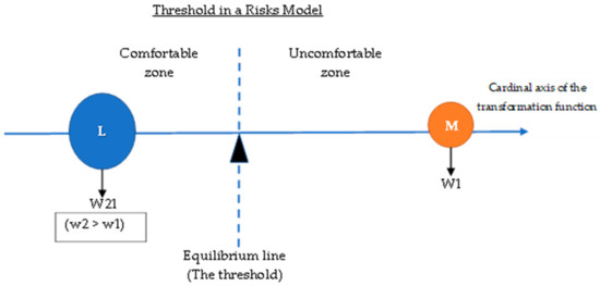 There are two points that represent two consecutive levels of a scale. Without losing generality, it is possible to say that these tow points of the scale are L (low) and M (moderate). In a risk model, L represents a lower risk level and therefore the expert’s comfort zone (where he feels comfortable), while M represents a higher risk level or the expert’s discomfort zone. Note: In a benefits model, exactly the opposite happens.
