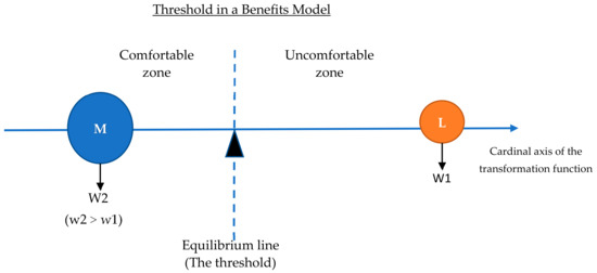 It is through rate of change and center of gravity that we know the threshold’s value. Due to the levels of the scale having different values, they need to be balanced (find the equivalence between them); for example, how many “Lows” of the scale make one “Moderate” within the same scale of measurement? Once this issue is solved, then it is possible to apply the center of gravity formula to find the geometric equilibrium point between both consecutive levels; this point represents the local threshold value of the scale.