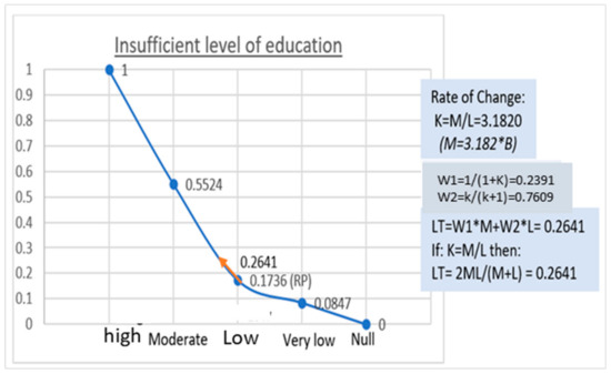 If it should be conducted in reverse, that is, w2 = 1 (now, w2 is the unit), the result would be the same assuming that w1 = L/M (<1); the rate of change is inverted to maintain the concept of the most weighted zone in a risk model (w2 > w1). This leads to