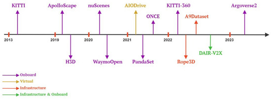 Fortunately, during the last decade, the growing interest in vehicle 3D pose estimation has led to an increase in the availability of public datasets for researchers. This surge in resources has significantly expanded the possibilities for experimentation, enabling the development of more complex and accurate detection models. In Figure 1, a timeline illustrating the increase in public datasets available during the last years is displayed, showcasing the clear trajectory of increasing complexity and diversity over the years. This timeline shows the evolution from early datasets, focused on limited scenarios and fundamental vehicle perspectives, to more complex situations that encompass variable weather conditions and different points of view. Additionally, in Table 1, some of the most important characteristics of the datasets, such as the quantity of data available and the types of conditions covered, are displayed.