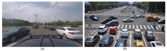 To better illustrate the advantages of infrastructure-based data acquisition, Figure 4 provides a side-by-side comparison of images captured from an infrastructure-mounted camera and a vehicle-mounted camera. This visual comparison highlights the broader field of view and the reduced occlusions achieved with infrastructure-based viewpoints. Notably, the infrastructure camera captures a comprehensive scene of the road and surrounding area, offering clearer insights into traffic patterns and vehicle interactions, which are often occluded in vehicle-based images. These characteristics are crucial for algorithms that require detailed and unobstructed views to accurately estimate vehicle dimensions and positions.