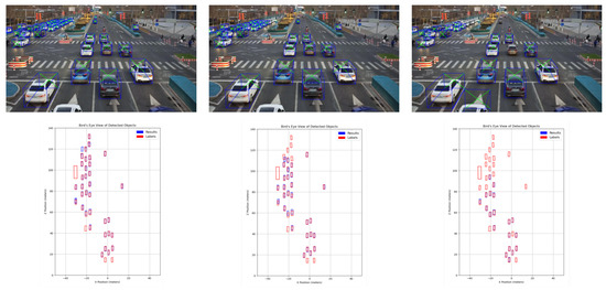 Moreover, the accuracy and reliability of monocular 3D object detection systems can be substantially affected by environmental factors, such as lighting changes and extreme weather conditions, which can severely impair the detection capabilities of the algorithms [34]. Additionally, specific traffic characteristics, such as large trucks occluding vehicles behind them or high-density traffic patterns, can reduce the system’s accuracy and reliability.