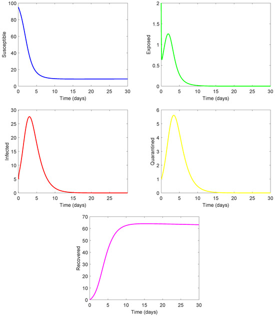 In the present model, the variables for the diphtheria transmission were defined as follows, according to [48]. N represents the total population within a defined location comprising of five cluster of sub-population variables; the susceptible , the exposed , the infected , the quarantine , and the recovered . ‘Susceptible’ refers to the individuals who are not vaccinated and are thus capable of being infected by diphtheria, whereas the ‘recovered’ implies individuals that are vaccinated and, therefore, are presumed to be protected from being infected by diphtheria. The ‘infected’ are those individuals who are affected by the diphtheria disease, and their level of contact interactivity with the susceptible individuals permits the spread of the diphtheria infection.