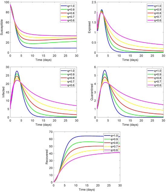 First, we numerically solved the proposed model (4) and found the numerical solutions of each compartment, as depicted in Figure 3, for the case of integer-order derivatives, (i.e., ). To visualize the complex dynamical behavior of the fractional-order model (4), and help us to obtain a deeper insight, we varied the order and obtained the numerical results shown in Figure 4. Based on the findings, we can conclude that changing the order will result in a visual representation of an increase or decrease in the number of individuals in each compartment, which is not seen in the classical version of the model. This hidden phenomenon can assist government agencies and medical practitioners in controlling the spread of infection. Additionally, our findings indicate that as the order increases, the time required for convergence decreases.