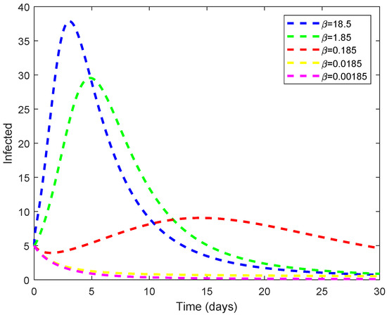Effect of the transmission rate on the infected individuals when .