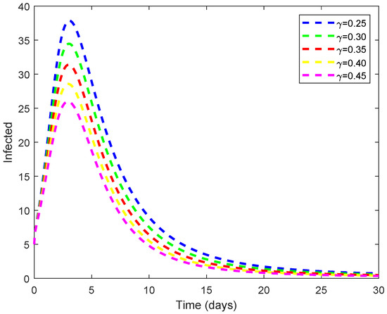 Table 2 shows that the interaction between susceptible and infected individuals has a positive impact on infection transmission, with a sensitive index of . Thus, we varied the rate of the interaction parameters, as seen in Figure 5. Figure 6 shows how changing the transmission rate affects the number of infected individuals. In response to the results, decreasing the rate of transmission will result in fewer infected individuals. Figure 7 illustrates how increasing the treatment rate reduces the number of infected individuals. In addition, increasing the treatment rate will reduce the basic reproduction number.