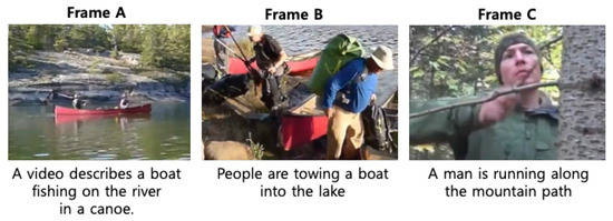 With the success of large-scale image caption models [1,2,3,4,5,6,7] using large amounts of image–text pairs in a transfer learning paradigm, interest has recently turned to the video domain. Video captioning [8,9,10,11,12,13,14,15] is the task of describing the visual scene of a given video in natural language. It is much more challenging than image captioning, which only addresses a static piece of information, in that it requires a comprehensive understanding of multiple frames over the entire video. In fact, from a visual perspective, the key is that the model should have the ability to understand both the static information and the dynamics presented over multiple frames. Moreover, from a linguistic point of view, it should be able to generate coherent descriptions.