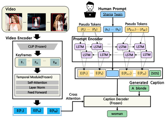 We adopt a similar assumption as [31], where in the interaction mode a human provides a short prompt containing two or three words. The key difference is that we do not use a human prompt with the initial seed words of the caption; instead, a human prompt serves as implicit guidance to refine the caption. Inspired by [32], we employ a soft prompting method that allows the model to adjust the captions using the prompt. As shown in Figure 3, K pseudo tokens are added to the front and back of the human prompt (e.g., “Shania Twain”). In this work, we set K to 5, which can be determined experimentally. A bidirectional LSTM is used as the prompt encoder. The prompt is passed to the prompt encoder, which ultimately makes the embedding of the pseudotoken reflect the context information according to the human prompt. The embedding () for the pseudotoken () is generated by concatenating the hidden layers of each LSTM layer. These are directly used as the token embeddings of the caption decoder. We exploit a teacher-forcing training strategy using the cross-entropy loss between the generated captions and the correct captions. During inference, we employ a beam-search decoding method to obtain adaptive captions. The search begins with the start symbol token (SOS) after feeding the prompts.